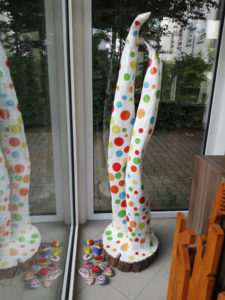Update September 2025: Die Skulptur ist fertig! Sie steht nun im Foyer von Haus 4, ein bunter Blickfang für alle, die vorbei- oder hineingehen. Wir haben die bemalten Steine dazu gelegt und das sieht so aus: